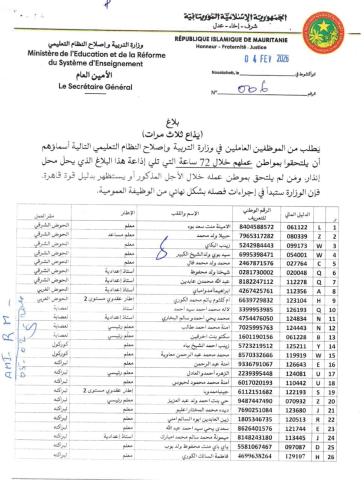 وقالت الوزارة في بلاغ لها إن أي موظف من هؤلاء لم يلتحق بعمله خلال 72 ساعة التي تلي إذاعة البلاغ الذي يحل محل إنذار، أو يستظهر بدليل قوة قاهرة، فإن الوزارة ستبدأ في إجراءات فصله بشكل نهائي من الوظيفة العمومية.