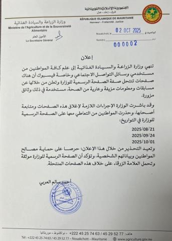 تنهي وزارة الزراعة و السيادة الغذائية إلى علم كافة المواطنين من مستخدمي وسائل التواصل الإجتماعي، و خاصة فيسبوك، أن هناك صفحات تنتحل صفة الصفحة الرسمية للوزارة و تعلن من خلالها عن مسابقات و معلومات مزيفة و عارية من الصحة، مستخدمة في ذلك وثائق مزورة.
