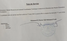 وقع مدير إدارة مشاريع التهذيب والتكوين محمد المختار ولد سيدي محمد الناه يوم الثلاثاء 31 مارس المنصرم مذكرة عين بموجبها المهندس أحمد بوزفره منسقا فنيا مركزيا للمشاريع في إدارته، وذلك على الرغم من اتهامه من طرف القضاء في الملف المعروف بـ"ملف طاولات وزارة التربية"، وإحالته إلى المحكمة المختصة في ملفات الفساد لمحاكمته.