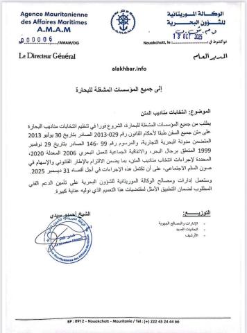 طالبت الوكالة الموريتانية للشؤون البحرية كافة المؤسسات المشغلة للبحارة الشروع فورا في تنظيم انتخابات مناديب عمال البحر.