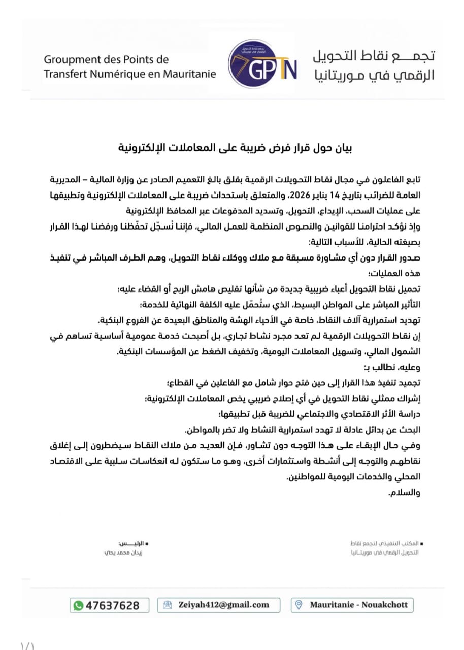 طالب تجمع نقاط التحويل الرقمي في موريتانيا بتجميد قرار الضريبة الإلكترونية الصادر عن المديرية العامة للضرائب قبل أيام إلى حين فتح حوار شامل مع الفاعلين في القطاع، كما أبدى تحفظه عليه بصيغته الحالية.