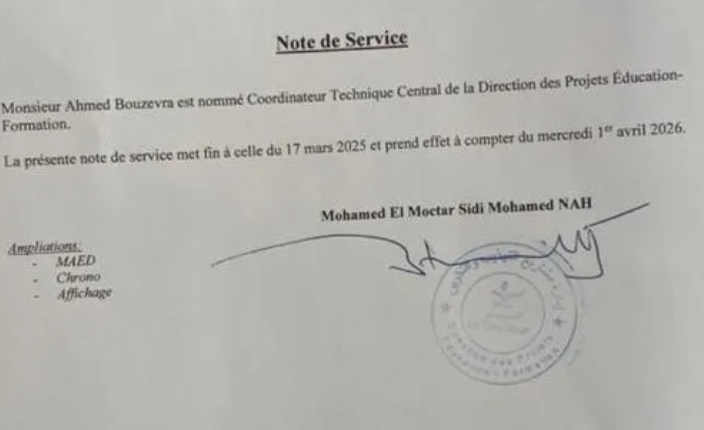 وقع مدير إدارة مشاريع التهذيب والتكوين محمد المختار ولد سيدي محمد الناه يوم الثلاثاء 31 مارس المنصرم مذكرة عين بموجبها المهندس أحمد بوزفره منسقا فنيا مركزيا للمشاريع في إدارته، وذلك على الرغم من اتهامه من طرف القضاء في الملف المعروف بـ"ملف طاولات وزارة التربية"، وإحالته إلى المحكمة المختصة في ملفات الفساد لمحاكمته.