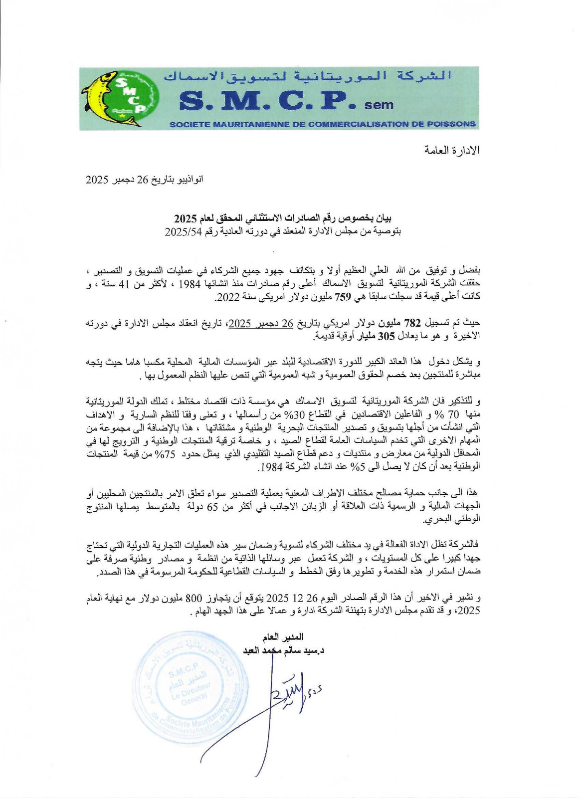 أعلنت الشركة الموريتانية لتسويق الأسماك أن صادراتها بلغت حتى ديسمبر الجاري 782 مليون دولار، أي 305 مليار أوقية قديمة.